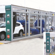 隧道式洗車機與往復式不同的是汽車隨著隧道前進,洗車設備在固定位置不動,車開出隧道即完成整個洗車過程。洗車速度更快,可以連續洗車,清洗一輛車的時間大約為2分40秒,適合一天洗120輛車以上的汽車美容店。